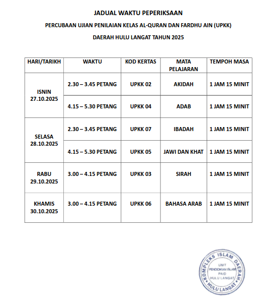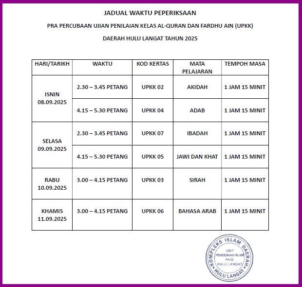 Jadual PERCUBAAN UPKK 2025